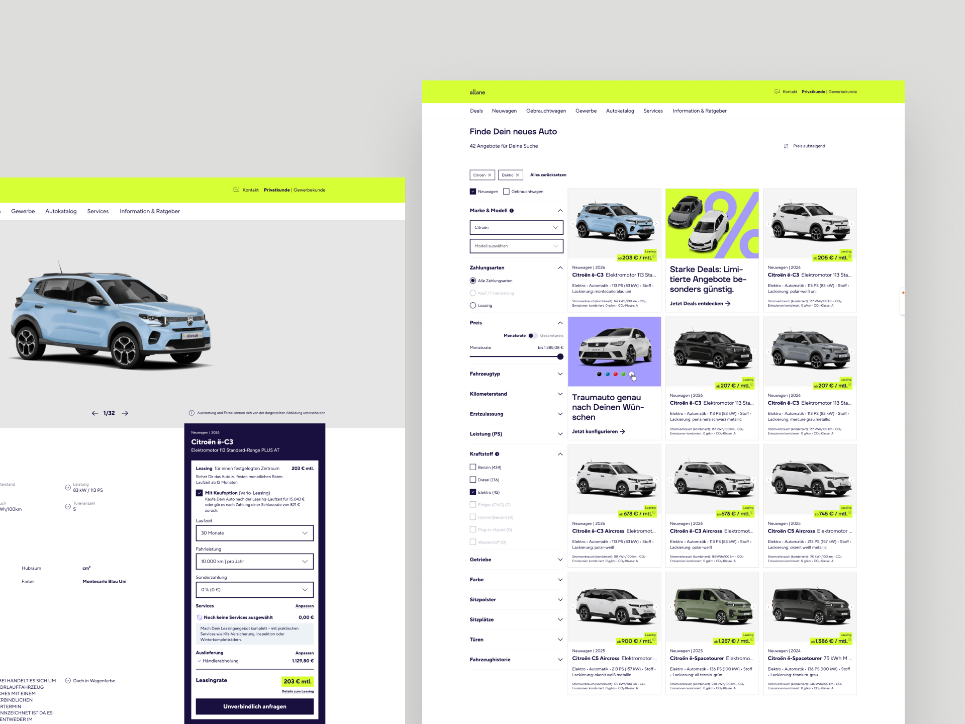 Allane ist eine neue Marke im Bereich Fahrzeug-Leasing. Ziel war die Entwicklung einer skalierbaren digitalen E-Commerce-Plattform für unterschiedliche Fahrzeugangebote – von Neuwagen über Gebrauchtwagen bis hin zu Leasing-Deals – sowie zugehörige Services.